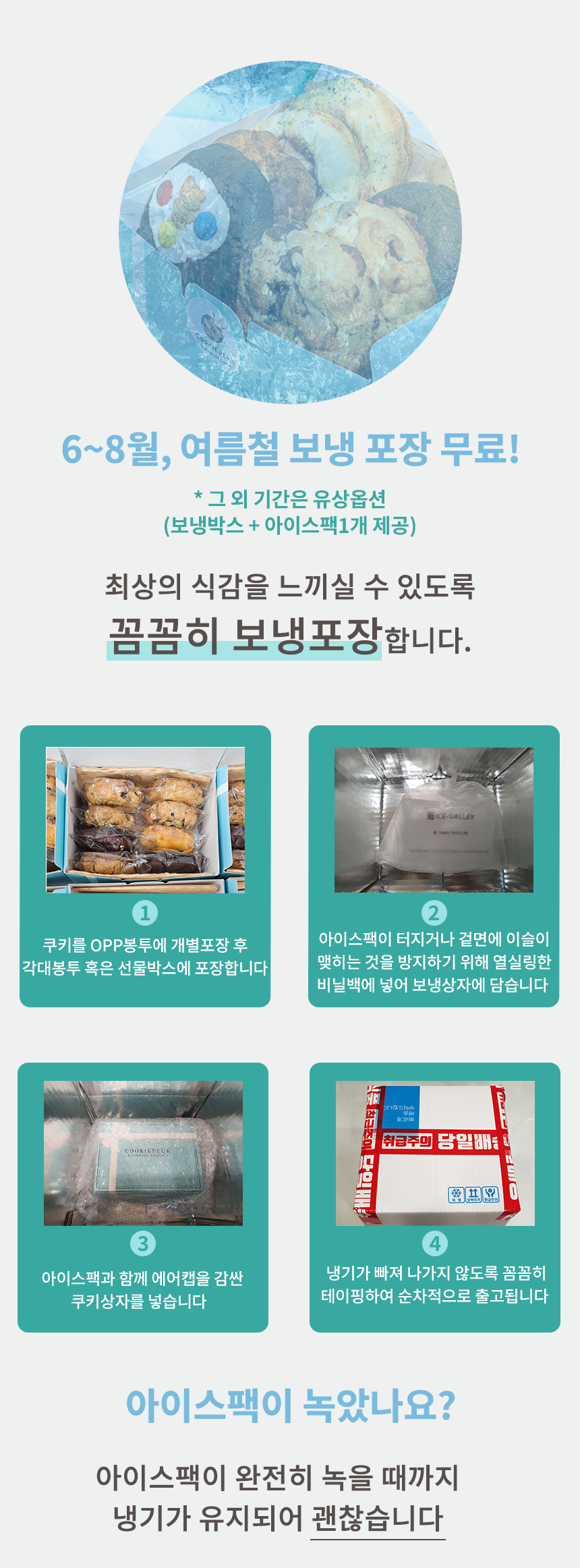 냉장 보관 시 : 수령일로부터 5일 내 취식, 꺼내서 바로 차갑게 드시면 꾸덕한 최고의 식감🍪 (쿸사장 추천!👍)